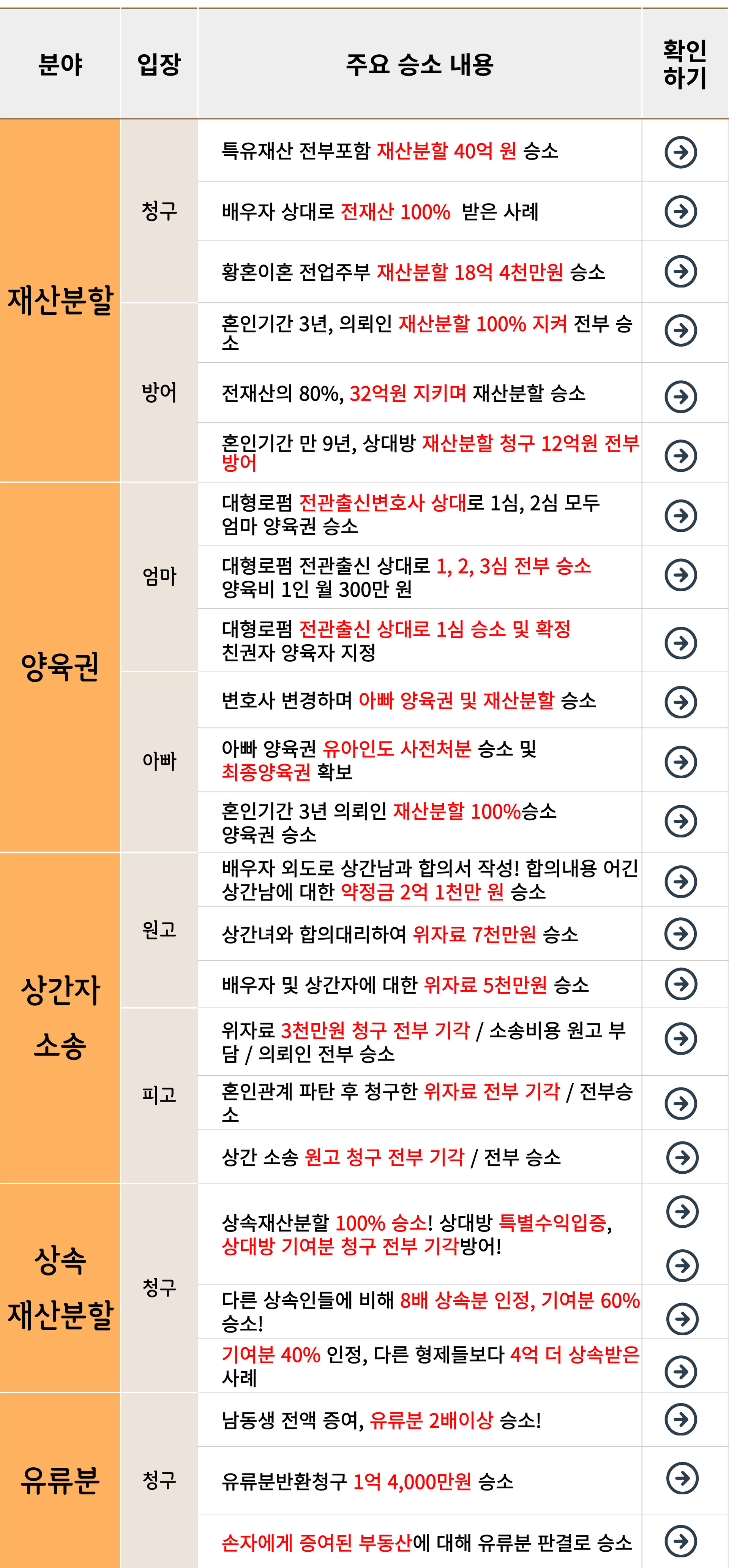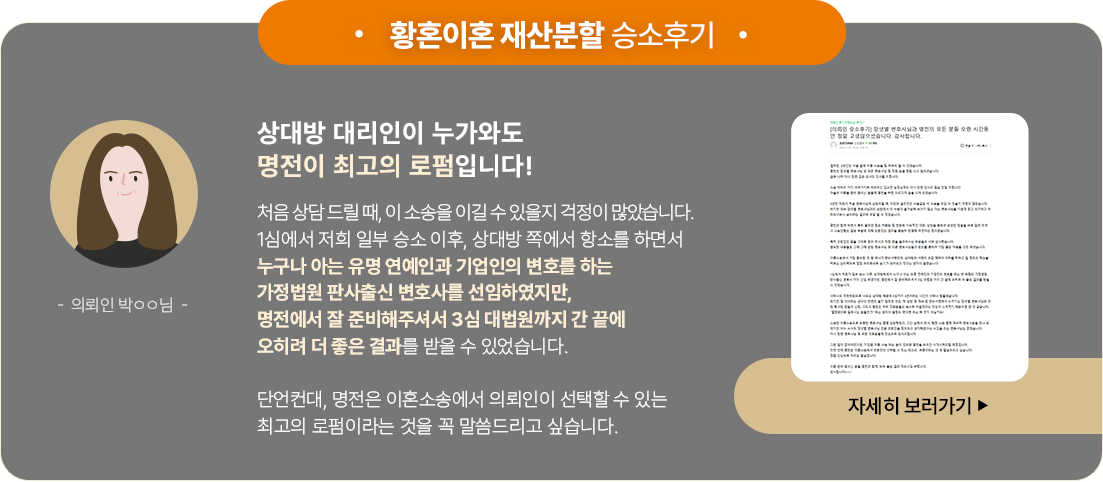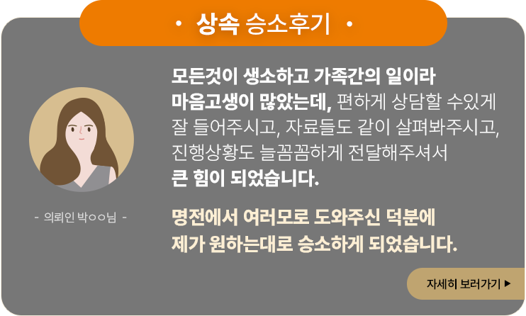 명전은 가족법 특화시스템으로 일이 잘 되는 본질에 집중하며 '이혼상속 승소의 기준'을 주도해 왔습니다. | |||