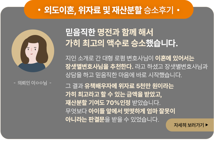 [성격문제] 혼인기간 3년가량, 의뢰인 재산분할 100%승소! 위자료 전액 방어 및 재산 100% 전부 방어승소! 양육권 승소사례!